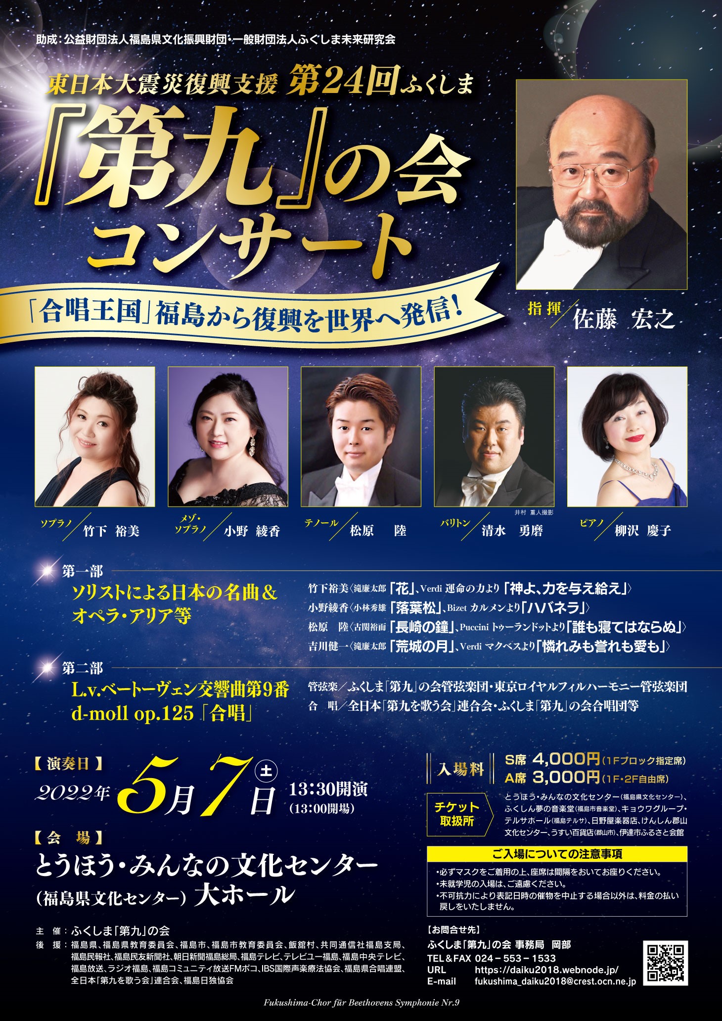 2022年5月7日の「第九コンサート」 は(コロナ禍のもとながら)大成功のうちに挙行されました。以下は、その福島での「全国からの第九の会合唱団」によるコンサートチラシと、第1部に出演されたピアニストが音楽事務所の担当マネージャーに送った報告書です。